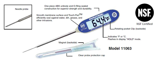 這個(gè)大屏顯示的防水溫度計(jì)是測(cè)量烹煮中和保溫中食物溫度的理想工具。根據(jù)FDA的食品法典第4-302條,溫度計(jì)構(gòu)造圖,其探針針尖設(shè)計(jì)保證其快速的反應(yīng)時(shí)間,水銀溫度計(jì),用以測(cè)量較小塊/片的食物。 其特點(diǎn)包括: