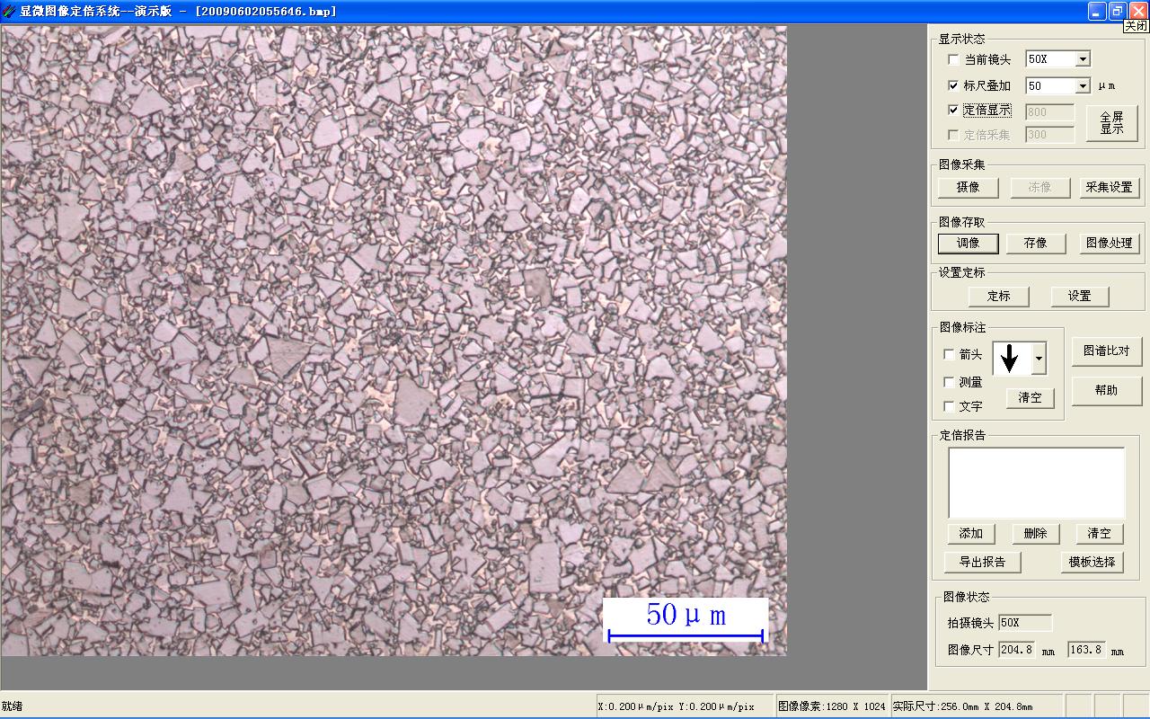 3.定倍存儲:按照指定倍率,存儲圖像文件。該文件可在任何OFFICE系統(tǒng)中打開,金相分析軟件下載,并按指定倍率打印。