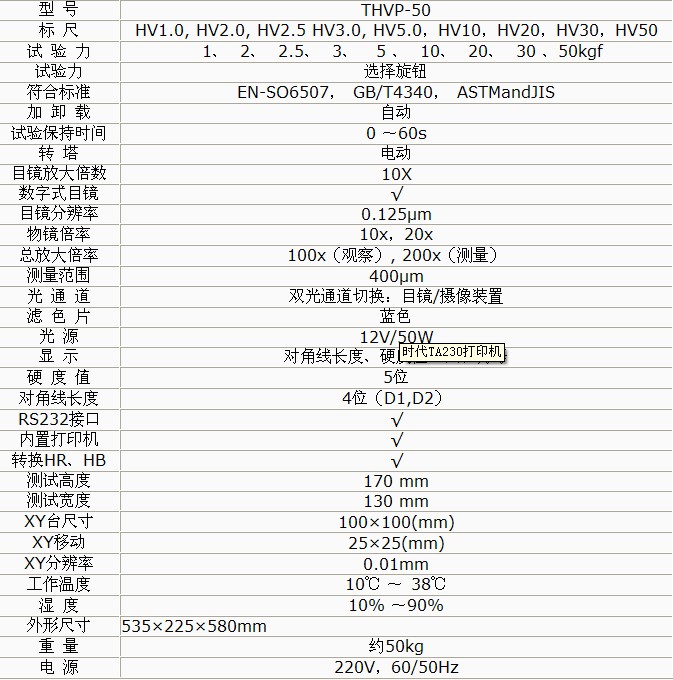 產品概述: 數顯維氏系列硬度計是光機電一體化的高新技術產品,顯示屏使用大的LCD屏幕,它造型新穎、美觀,具有良好的直觀性、可操作性和可靠性,是測試維氏 硬度的理想產品。該機的壓頭和物鏡之間的轉換采用自動切換裝置。 數顯維氏系列硬度計是光機電一體化的高新技術產品,,顯示屏使用大的LCD屏幕,,它造型新穎、美觀,具有良好的直觀性、可操作性和可靠性,是測試維氏硬度的理想產品。該機的壓頭和物鏡之間的轉換采用自動切換裝置。 適用于測量微小、薄形試件、表面滲鍍處理后的零件和對瑪瑙、玻璃、陶瓷等脆性材料的顯微和努氏硬度的測定 以及涂層、表面覆層、層壓金屬、熱處理碳化層和淬火硬化層的深度與硬度梯度的測定。是科研機構、工廠及質檢部門進行研究和檢測的理想的硬度測試儀器。 功能特點: 1 、硬度計在機械上采用精密的結構設計,在光學上采用高倍率物鏡和數顯式測微目鏡,測量光源采用冷光源等先進技術。 2、采用閉環(huán)式加載控制系統(tǒng),使試驗力精度提高,示值的重復性及穩(wěn)定性佳。該系統(tǒng)用在維氏硬度計上,,在國內屬首創(chuàng)。 3、 操作由面板上的觸摸鍵輸入,能預置試驗力保荷時間、調節(jié)測量光源的強弱、選擇維氏或努氏測試模式、硬度轉換標尺、文件號與儲存等。并能在屏幕 上顯示測量壓痕長度、硬度值、測量次數和年、月、日及時間等,試驗結果和數據處理,并通過打印機輸出,還能通過RS232接口與計算機連接。 硬度計還可根據用戶特殊需求配置CCD裝置、視屏裝置和攝像裝置。 技術參數: