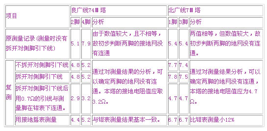 我們復(fù)測了110kV良廣線74#塔北廣線7#塔的接地電阻結(jié)果如表1所示: