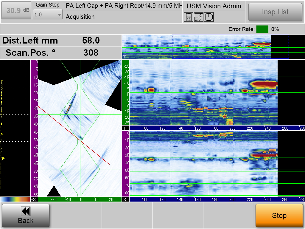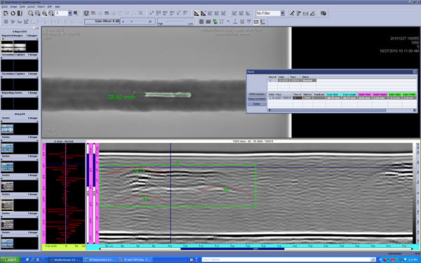 所有的檢測(cè)數(shù)據(jù)通過DICONDE兼容的Rhythm軟件平臺(tái)傳送到分析工作站。在這里,高級(jí)超聲檢測(cè)人員可以使用先進(jìn)的分析工具,超聲波探傷方法,直通波、拉直側(cè)通波、6dB法測(cè)長(zhǎng)等工具。除此之外,分析軟件還包含各種測(cè)量工具。