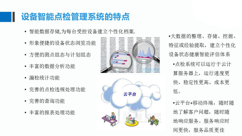 •  點檢系統(tǒng)運行于云計算服務(wù)器上,運行速度更快、穩(wěn)定性更高、成本更低。