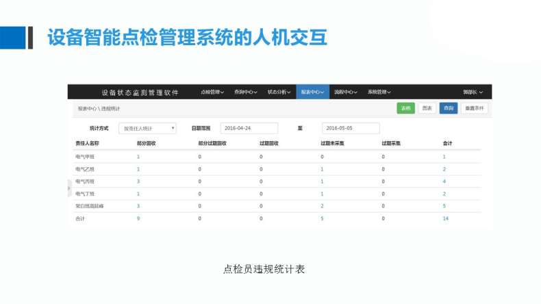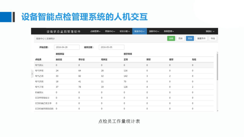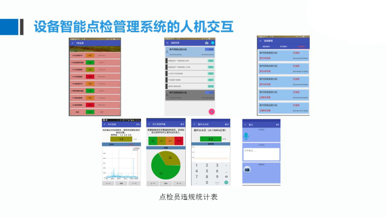 計劃點檢、臨時點檢、違規(guī)解釋、違規(guī)統(tǒng)計、生成計劃、狀態(tài)統(tǒng)計、任務(wù)交接