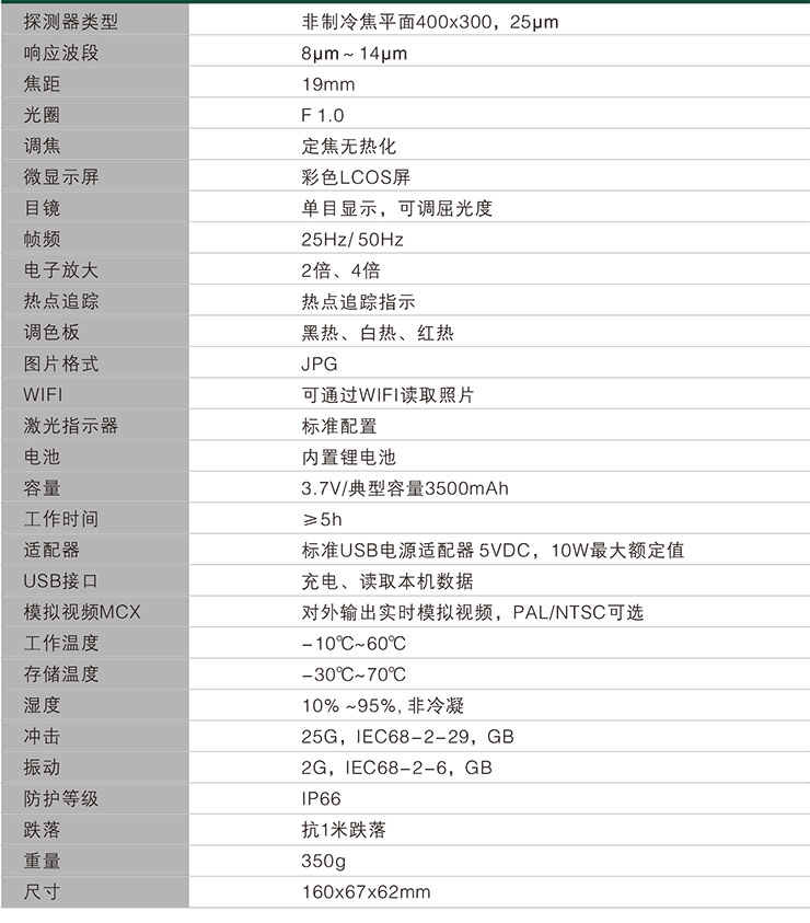 產(chǎn)品特點(diǎn) 可拍照,法國紅外熱像儀,并通過WIFI分享所拍攝照片,熱像儀,方便多人同時瀏覽 直觀的按鍵功能操作,防爆紅外熱像儀,無需培訓(xùn),紅外熱像儀 報價,符合人體工學(xué)設(shè)計,長期使用依 舊舒適 超靜音和防漏光設(shè)計,國產(chǎn)紅外熱像儀,使用時不暴露自身 內(nèi)置式鋰電池,5小時超長電池使用時間,并可外接便攜電源持續(xù)使用 標(biāo)準(zhǔn)Micro USB充電接口,新一代紅外熱像儀,適應(yīng)多種充電方式(適配器/車載點(diǎn)煙器/電腦/充 電寶) 激光指示器可用于目標(biāo)指示 IP66超強(qiáng)防護(hù)等級,抗1米跌落,適應(yīng)野外使用環(huán)境