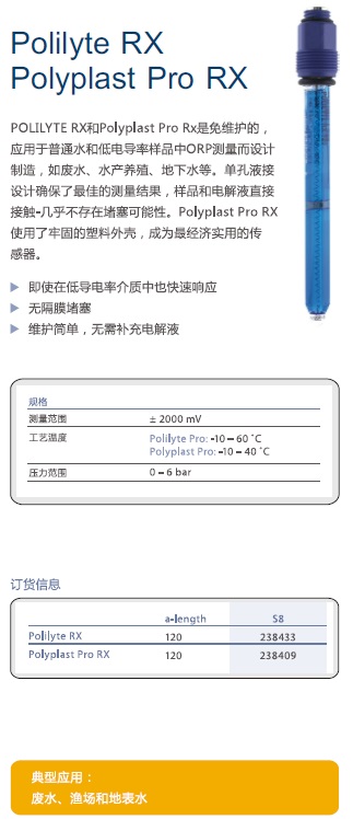 POLILYTE RX和Polyplast Pro RX是免維護(hù)的,應(yīng)用于普通水和低電導(dǎo)率樣品中ORP測(cè)量而設(shè)計(jì)制造,,如廢水、水產(chǎn)養(yǎng)殖、地下水等。單孔液接設(shè)計(jì)確保了最佳的測(cè)量結(jié)果,,樣品和電解液直接接觸-幾乎不存在堵塞可能性。Polyplast Pro RX使用了牢固的塑料外殼,成為最經(jīng)濟(jì)實(shí)用的傳感器。